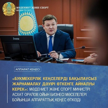 «БУКМЕКЕРЛІК КЕҢСЕЛЕРДІ БАҚЫЛАУСЫЗ ЖАРНАМАЛАУ ДӘУІРІ ӨТКЕНГЕ АЙНАЛУЫ КЕРЕК»: МӘДЕНИЕТ ЖӘНЕ СПОРТ МИНИСТРІ АСХАТ ОРАЛОВ ОЙЫН БИЗНЕСІ МӘСЕЛЕЛЕРІ БОЙЫНША АППАРАТТЫҚ КЕҢЕС ӨТКІЗДІ